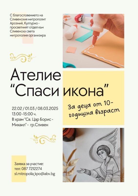 С благословението на Негово Високопреосвещенство Сливенският митрополит Арсений, Културно – просветният отдел към Сливенска света митрополия организира творчески ателиета „Спаси икона” за деца над десет години.