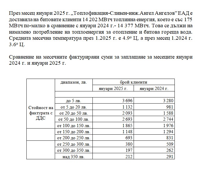 Анализ на потреблението през месец януари 2025 г. на клиенти на „Топлофикация-Сливен-инж.Ангел Ангелов” ЕАД