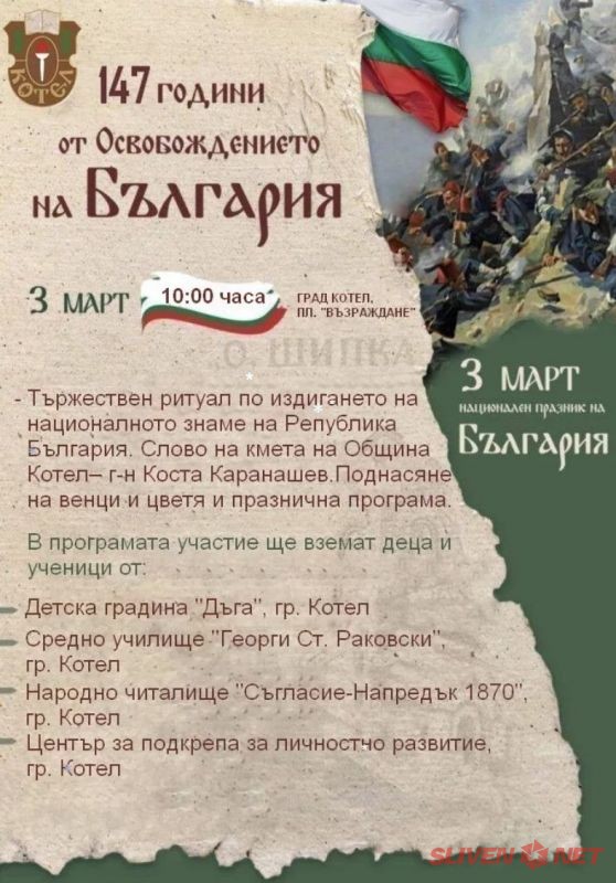 Празничната програма в Котел ще започне в 10:00 часа на площад „Възраждане“ с тържествен ритуал в чест на 147-ата годишнина от Освобождението на България. След него ще бъдат поднесени венци и цветя пред бюст-паметника на Георги Раковски.