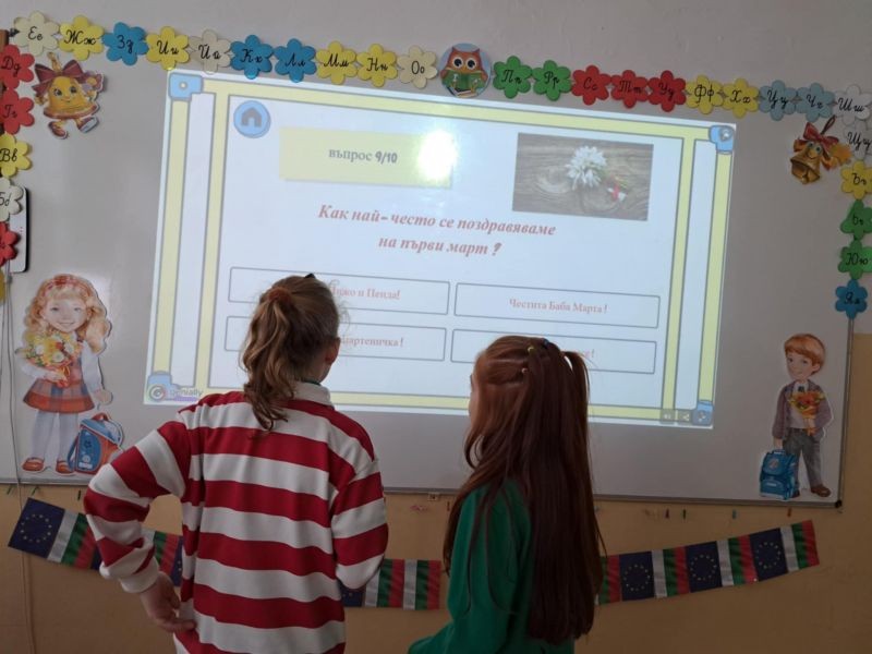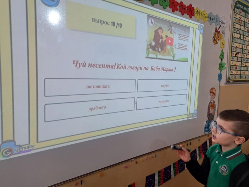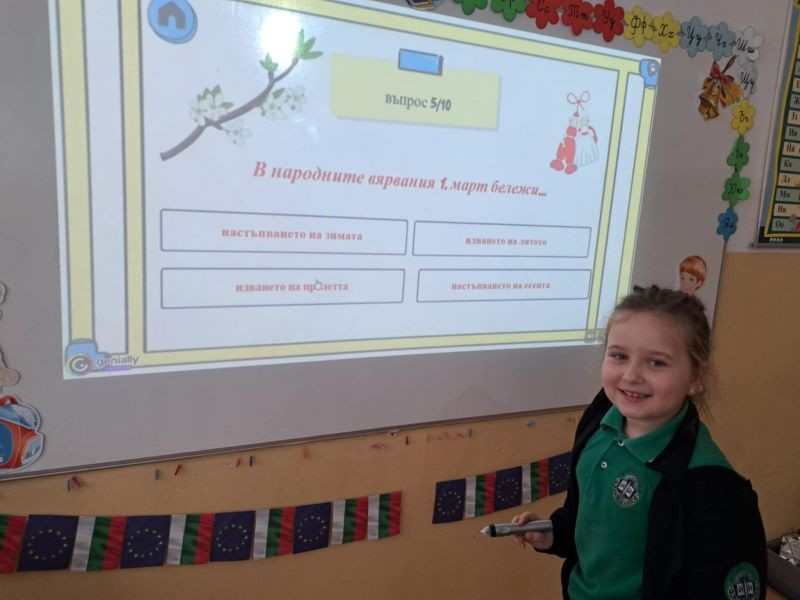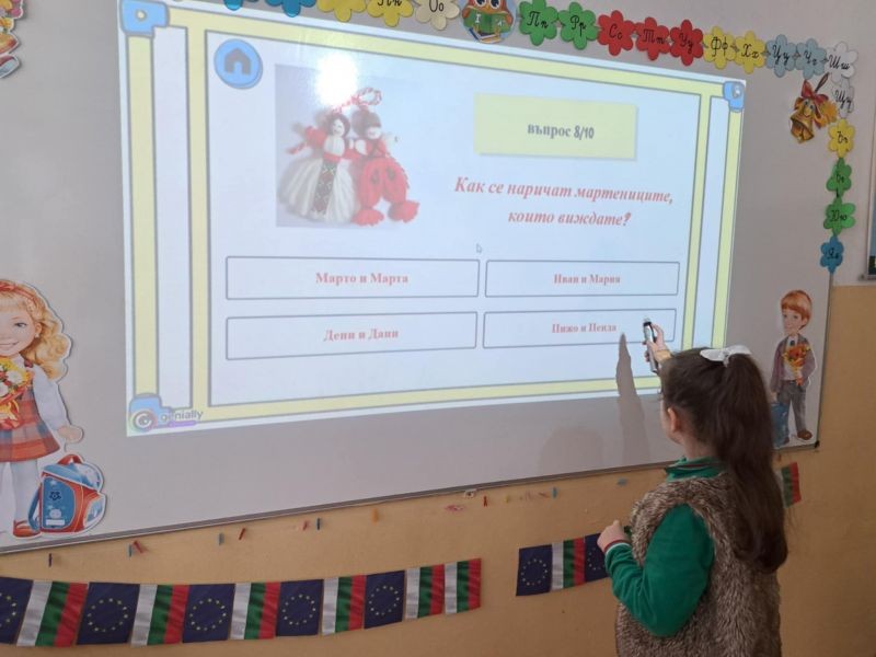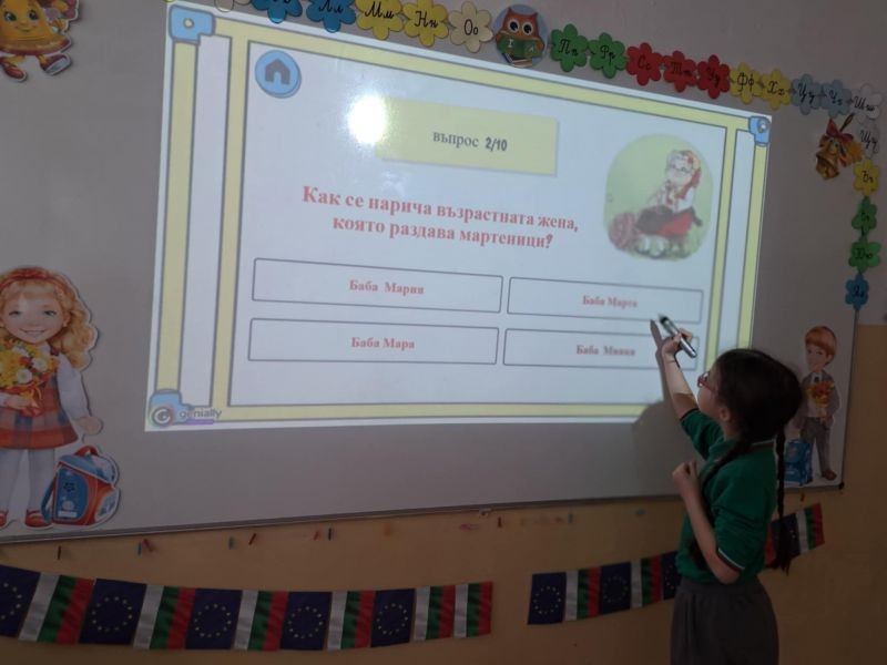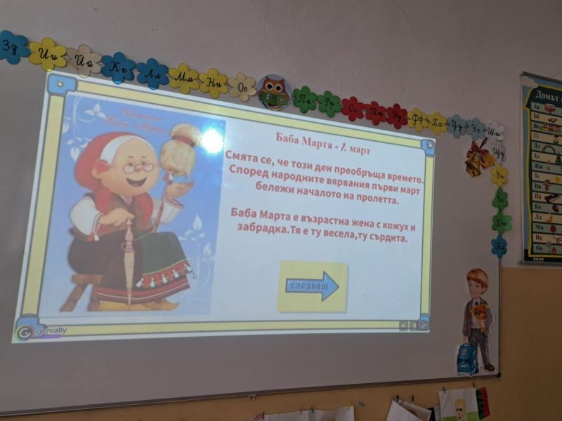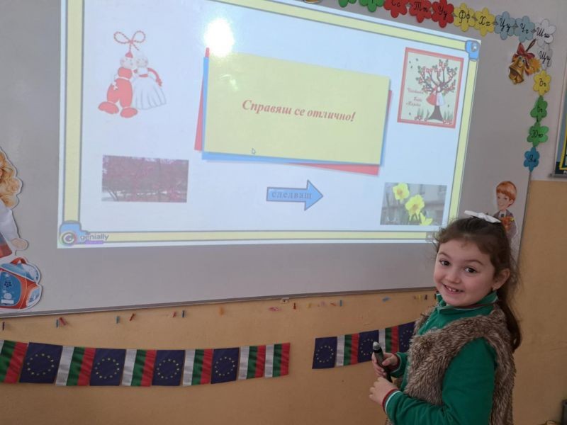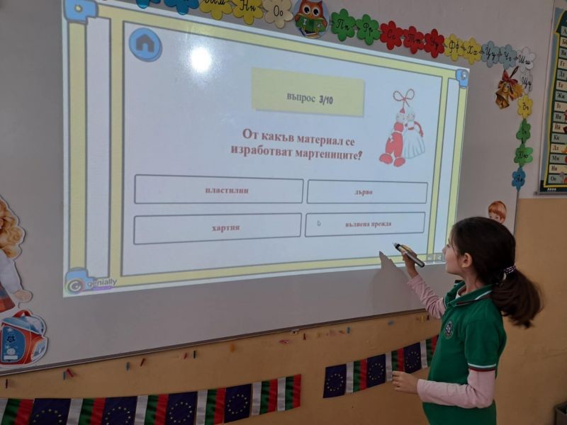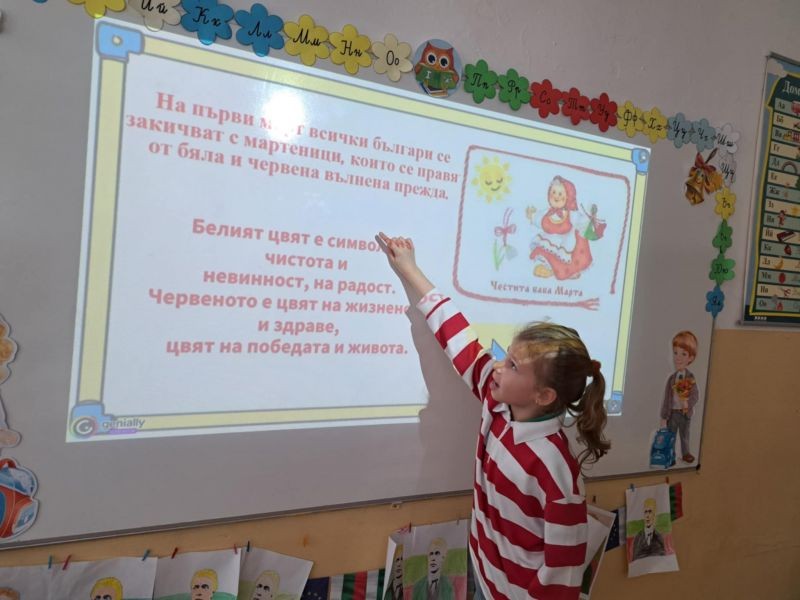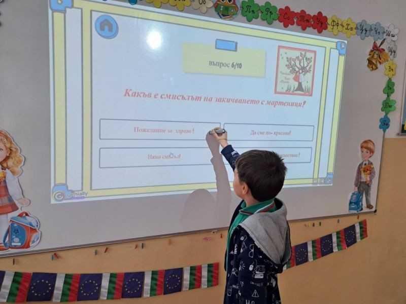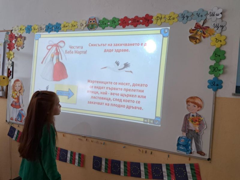 Децата с интерес изгледаха тематична презентация, която ги запозна с историята и символиката на празника. Чрез красиви изображения и достъпен текст, учениците научиха за значението на червено-белите конци и традицията да се закичваме с мартеници за здраве и благополучие.
