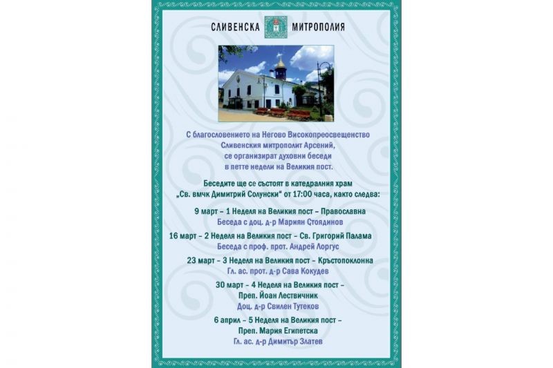 Беседите ще се състоят в катедралния храм „Св. вмчк Димитрий Солунски" в Сливен от 17:00 часа, както следва: