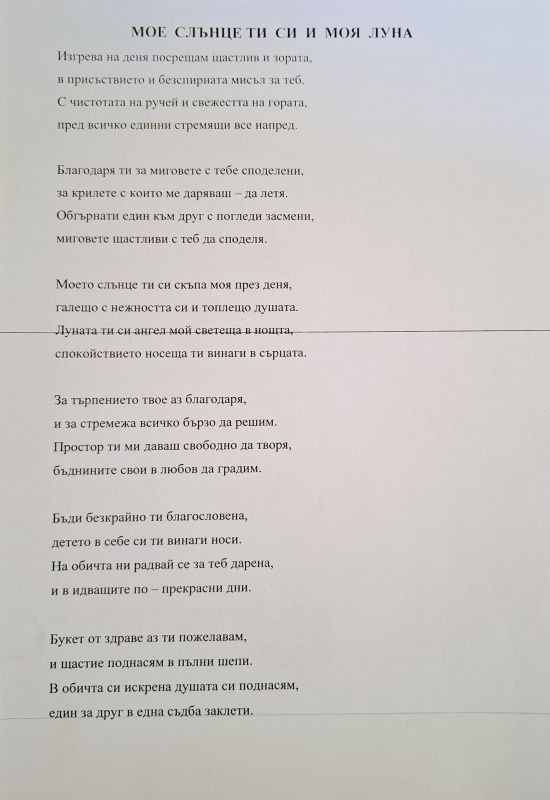 За поредна година инж. Калин Минчев от Дирекция „Общинска инфраструктура“ посвети своя лирика на дамите от община Сливен по случай Осми март. Авторът на стихотворението „Мое слънце ти си и моя луна“ поздравява нежната половина на човечеството с пожелание за здраве, щастие и да се чувства благословена от Господ.