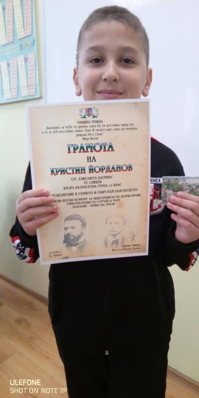 На състоялия се детски конкурс за видеорецитал на патриотични стихотворения по случай 3 март „България - майка на герои“, община Трявна награди Кристин Йорданов от II “г“ клас за изпълнение на стихотворение, посветено на Левски.