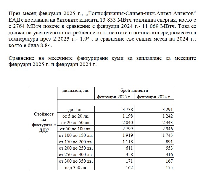 Анализ на потреблението през месец февруари 2025 г. на клиенти на „Топлофикация-Сливен-инж.Ангел Ангелов” ЕАД