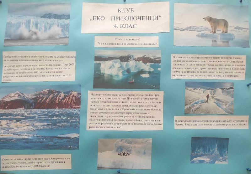 На 22 март, Световния ден на водата, четвъртокласниците от клуб "Еко-приключенци" демонстрираха своята ангажираност към опазването на водните ресурси и ледниците. Децата изработиха впечатляващи постери с послания, насочени към съхраняването на водата и защитата на ледниците.