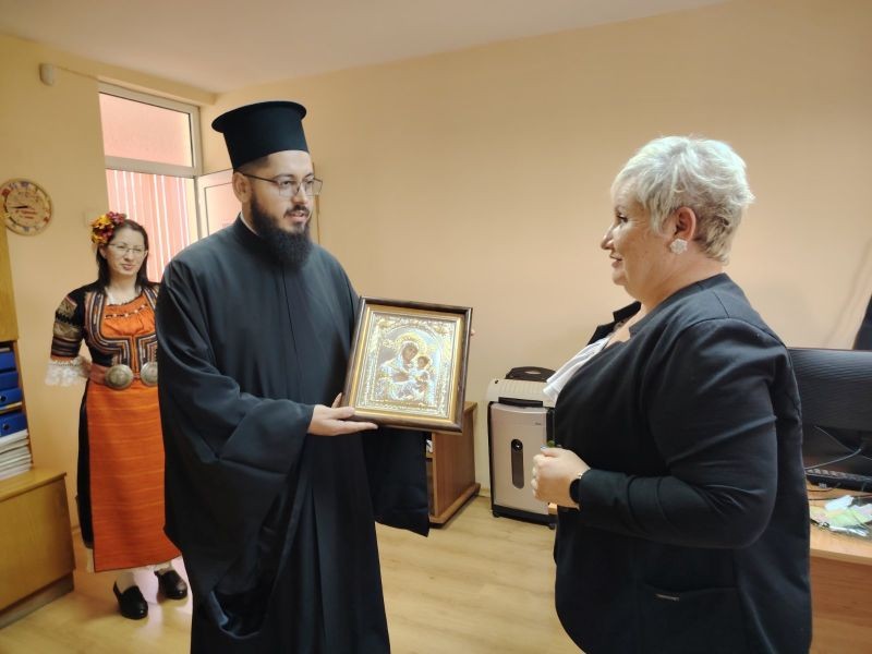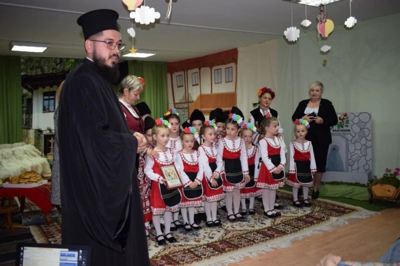 Дякон Владимир предаде архипастирския благослов на митрополит Арсений на директора на детската градина г-жа Янка Мандева, на учителите, децата и родителите, и поднесе за молитвен спомен и благословение икона с образа на Пресвета Богородица.
