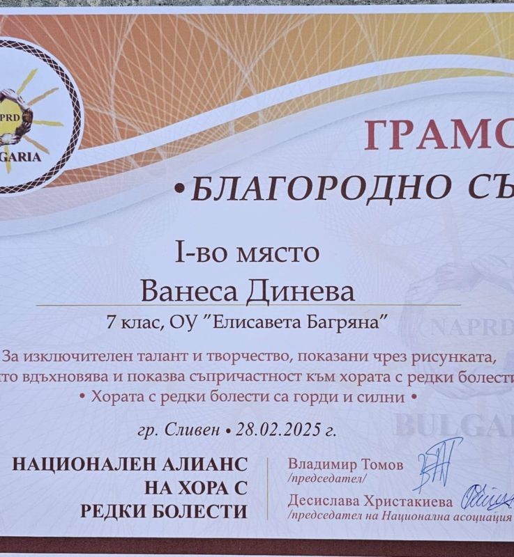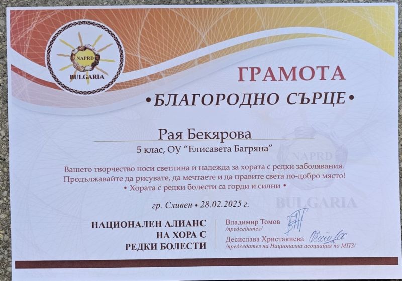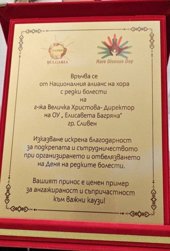 Директорът на ОУ "Елисавета Багряна", г-жа Величка Христова, бе наградена с плакет в знак на благодарност за подкрепата и сътрудничеството при организирането и отбелязването на Деня на редките болести.