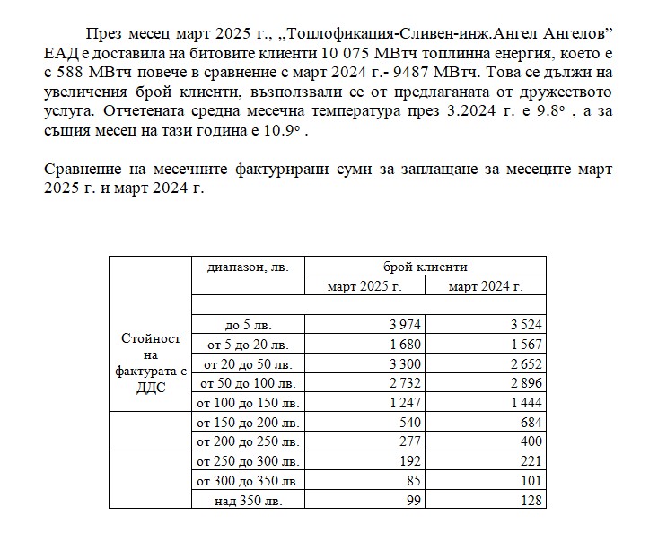 Анализ на потреблението през месец март 2025 г. на клиенти на „Топлофикация-Сливен-инж.Ангел Ангелов” ЕАД