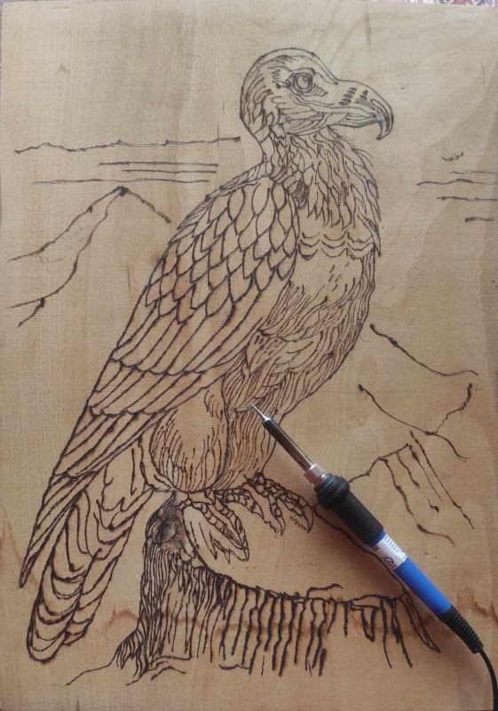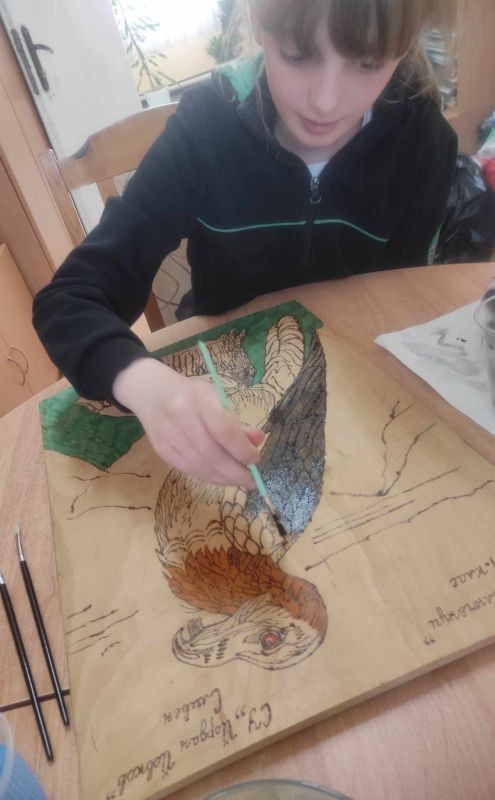 Творбата бе изработена с много труд и въображение върху дървена основа. Учениците първо нарисуваха лешояда, след това използваха пирограф за детайлите и накрая оцветиха картината, създавайки истинско произведение на изкуството. Техният талант и упоритост бяха възнаградени с най-високото отличие в конкурса. Ценни съвети и насоки при изработване на проекта получиха и от учителя по изобразително изкуство Димитър Кавръков.
