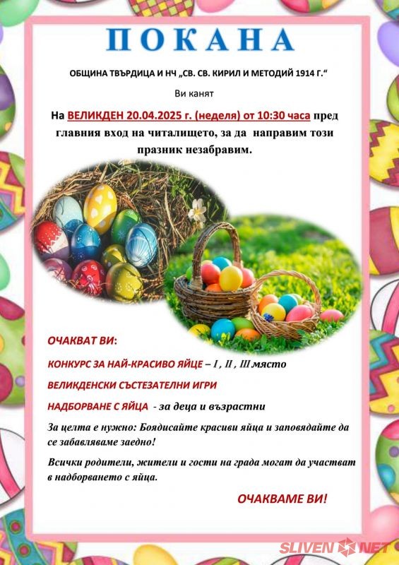 Община Твърдица и Народно читалище „Св. Св. Кирил и Методий 1914“ канят всички жители и гости на града да отбележат заедно най-светлия пролетен празник – Великден, с богата празнична програма на 20 април 2025 г. (неделя) от 10:30 часа пред главния вход на читалището.