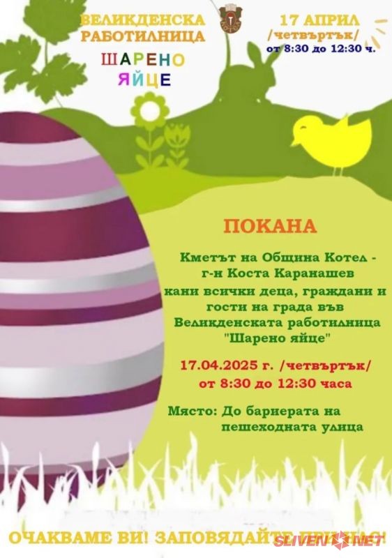 Община Котел и кметът Коста Каранашев отправят сърдечна покана към всички деца, жители и гости на града да се включат в едно от най-пъстрите събития от празничния календар – традиционната великденска работилница за боядисване на яйца „Шарено яйце“. Тя ще се състои на 17 април (Велики четвъртък) от 8:30 до 12:30 часа в района до бариерата на пешеходната улица в град Котел.