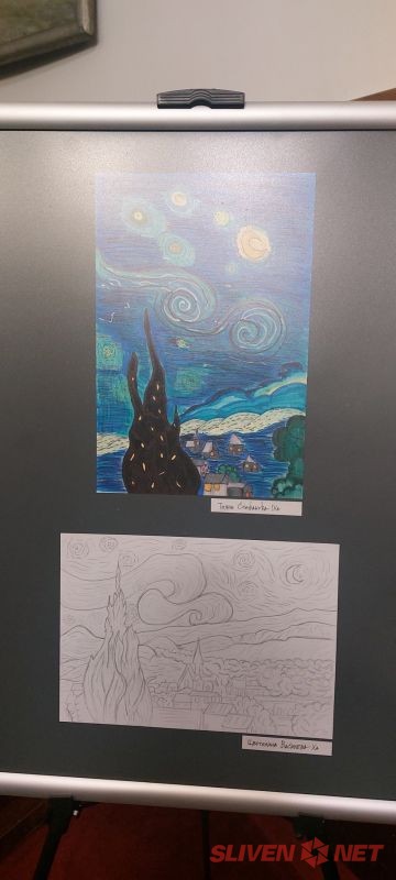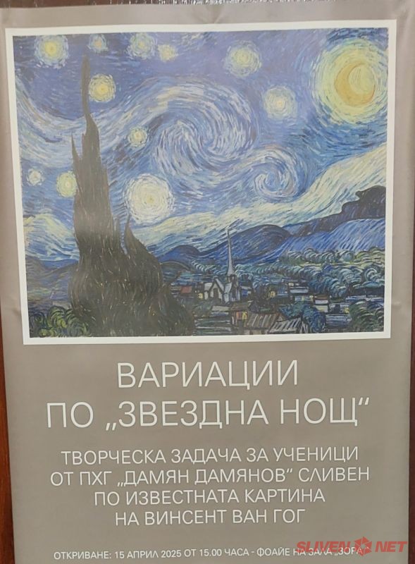 Фоайето на зала „Зора“ в Сливен оживя с цветове и въображение на 16 април 2025 г., когато беше открита изложбата „Вариации по „Звездна нощ“. Автори на творбите са ученици от Профилирана хуманитарна гимназия „Дамян Дамянов“, които се вдъхновиха от прочутата картина на Винсент Ван Гог, за да създадат свои интерпретации.