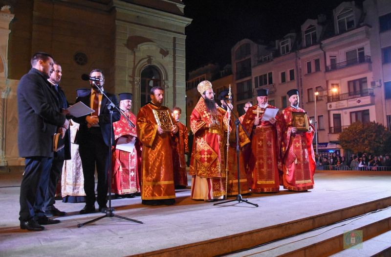 Светлините в храма бяха загасени и при пеенето на ”Приидите, приимите свет...” митрополит Арсений прикани всички богомолци да запалят свещите си, а на площада пред храма прочете Евангелското четиво, което Църквата е отредила да се чете на Възкресение, и бе дадено началото на Пасхалната утреня.