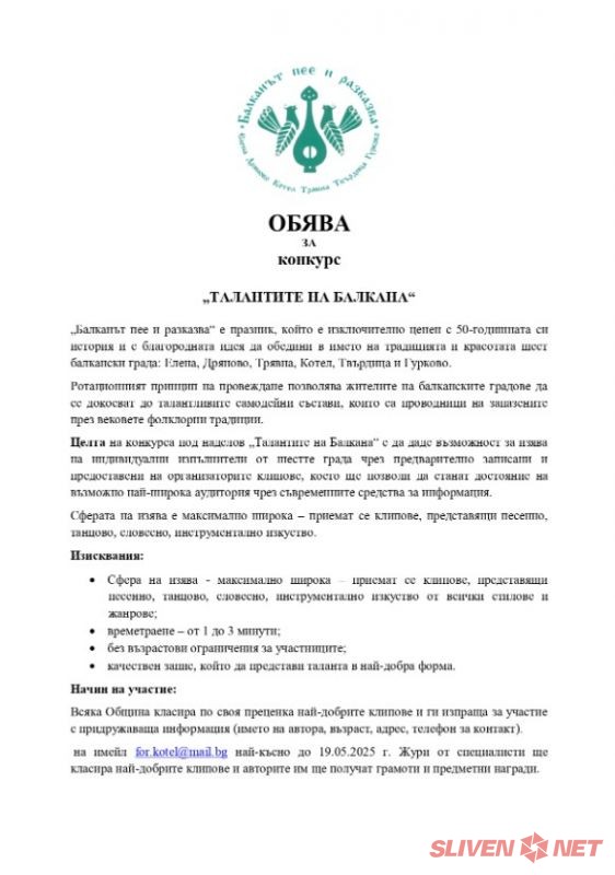 Община Котел отправя покана към всички деца и младежи, посещаващи местни читалища, клубове, училища и детски градини, както и към младите пазители на традициите и любители на изкуствата, да вземат участие в двата конкурса, които ще се проведат в рамките на празника „Балканът пее и разказва“ през 2025 г.