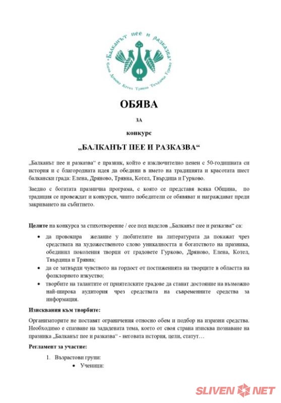 Конкурс за стихотворение/есе – на тема „Балканът пее и разказва“.
