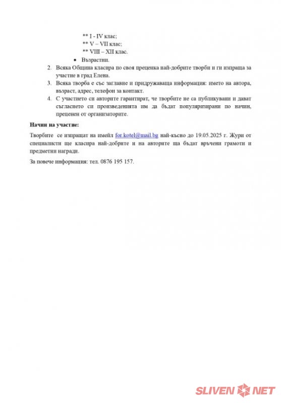Всички желаещи могат да изпращат своите видео изпълнения и литературни творби на имейл for.kotel@mail.bg до 19 май 2025 г. включително.