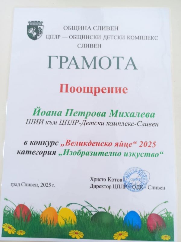 На 29.04. се състоя награждаване на конкурс "Великденско яйце 2025" в сградата на Детски комплекс - град Сливен. Ученичките на г-жа Здравка Долушанова отново са с награди.
