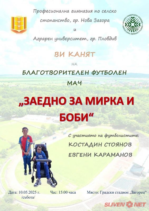 На 10 май 2025 г. от 15:00 ч. на стадион „Загорец“ в Нова Загора ще се проведе благотворителен футболен мач в помощ на Станимира Савова (17 г.) и Божидар Иванов (12 г.), които заедно със своите семейства водят ежедневна битка с диагнозата ДЦП.