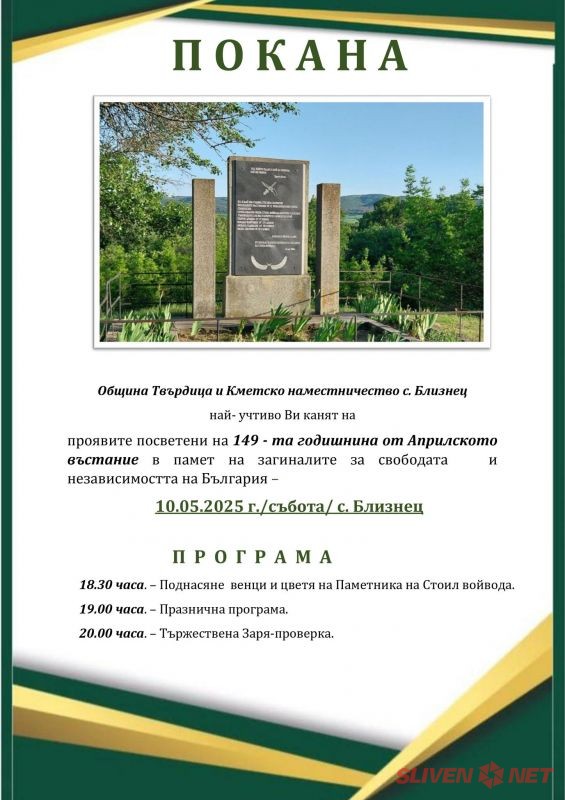 Община Твърдица и Кметско наместничество с. Близнец канят жителите и гостите на тържествено събитие, посветено на 149-ата годишнина от Априлското въстание. Проявите са в памет на загиналите за свободата и независимостта на България и ще се проведат на 10 май 2025 г. (събота) в с. Близнец.