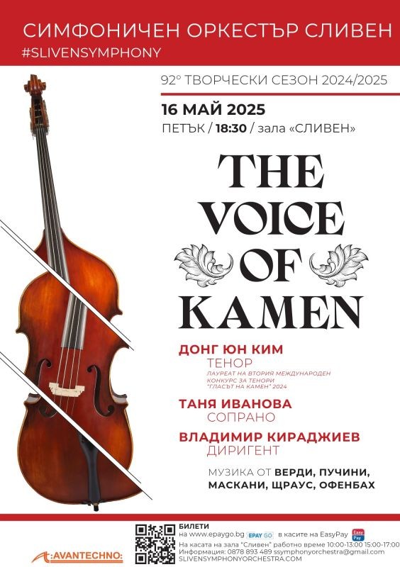 Сливенският симфоничен оркестър посреща лауреата на Втория международен конкурс за тенори „Гласът на Камен“`2024 - Донг Юн Ким и оперната прима Таня Иванова за един изключително специален концерт. Той ще протече под диригентството на маестро Владимир Кираджиев.