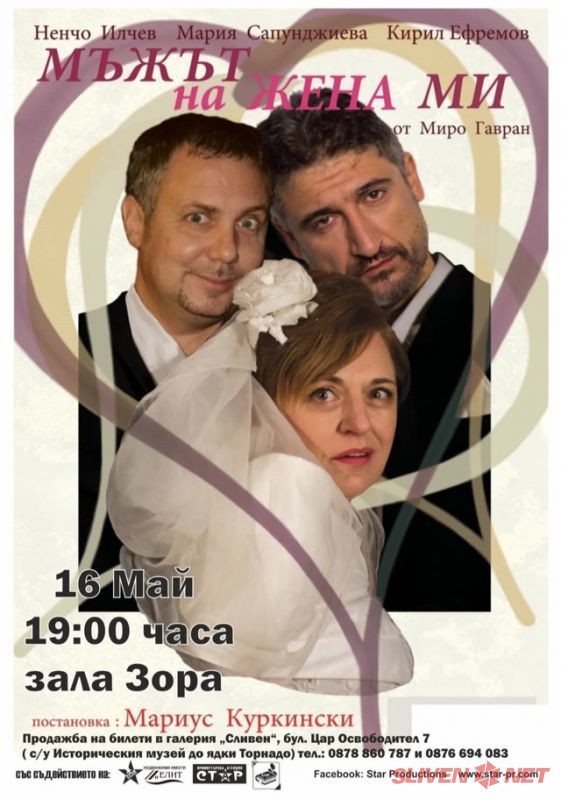 На 16 май (четвъртък) от 19:00 ч. до 21:00 ч. в зала „Зора“ – Сливен публиката ще има удоволствието да се наслади на блестящата комедия „Мъжът на жена ми“ от хърватския драматург Миро Гавран.