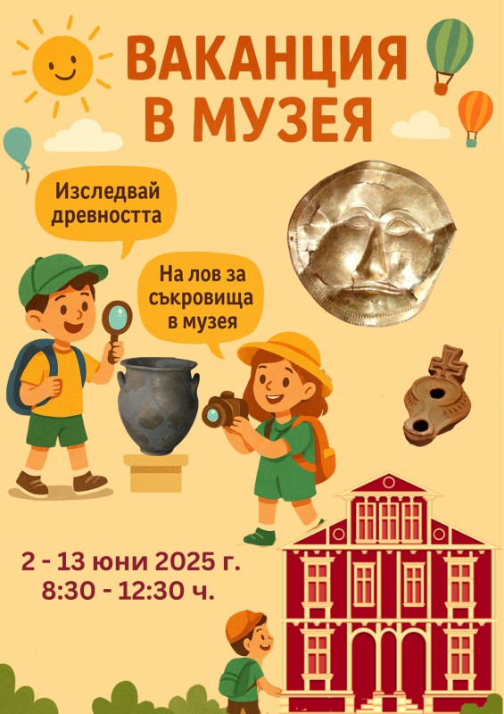 От 2 юни 2025 г., понеделник, започва лятното приключение „Ваканция в музея“, насочено към малките откриватели. Заедно ще учим и играем в различна от обичайната обстановка, докато разкриваме любопитни факти от нашето минало. Готови ли сте за пътешествие назад във времето, което ще Ви отведе на незабравими места и срещне с нови приятели?