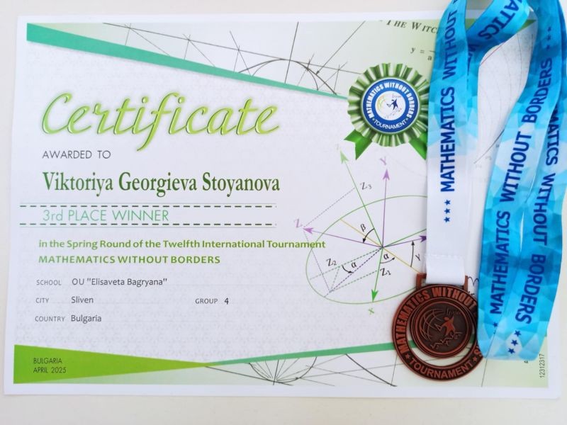 Виктория Стоянова от 4.А клас спечели бронзов медал в Международното математическо състезание "Математика без граници" - пролет 2025 година.