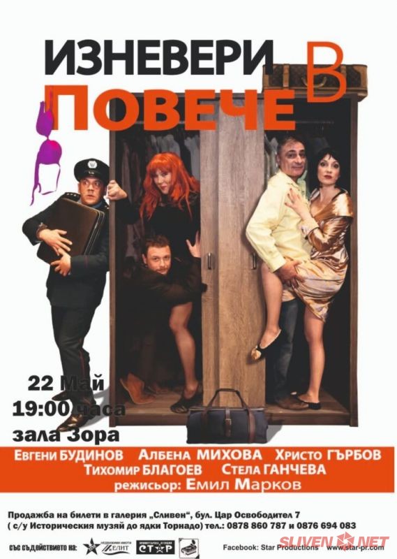 На 22 май (сряда) от 19:00 ч. в зала „Зора“ – Сливен зрителите ще имат възможност да се насладят на забавната комедия „Изневери в повече“, организирана от Star Productions. Постановката е по пиесата на Артур Нюфийлд, с режисурата на Емил Марков и сценография от Милен Боричев.