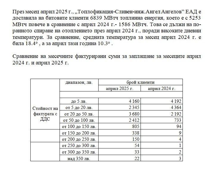 Анализ на потреблението през месец април 2025 г. на клиенти на „Топлофикация-Сливен-инж.Ангел Ангелов” ЕАД