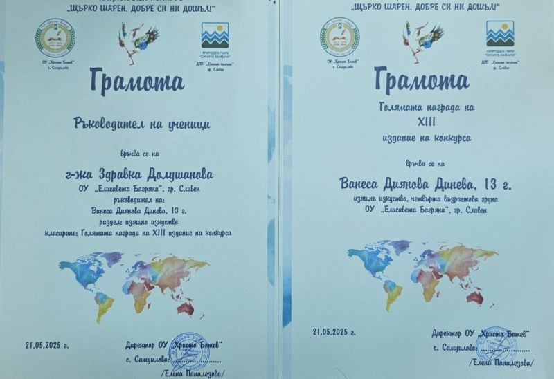 Сред наградените е Ванеса Диянова Динева от ОУ ,,Елисавета Багряна" - гр. Сливен от 7. ,,в" клас с учител Здравка Долушанова. Тя получи най-голямата и специална награда на конкурса. Г-жа Долушанова също получи грамота.