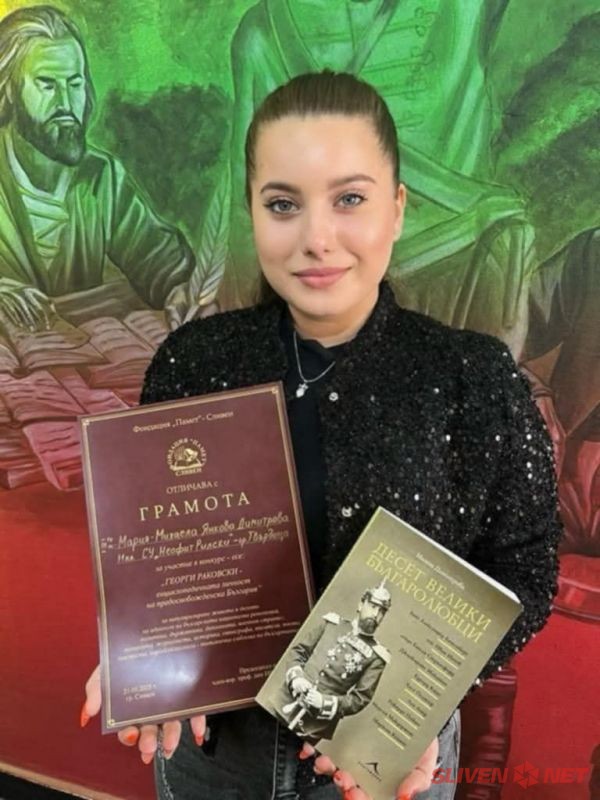 С радост съобщаваме, че в навечерието на 24 май – Деня на българската просвета, култура и славянската писменост – ученичката Мария-Михаела Димитрова от XI а клас на СУ „Неофит Рилски“ – гр. Твърдица, завоюва трето място в Националния конкурс „Георги Сава Раковски – енциклопедичната личност на предосвобожденска България“. Конкурсът е организиран от фондация „Памет“ и събра участия от цялата страна.