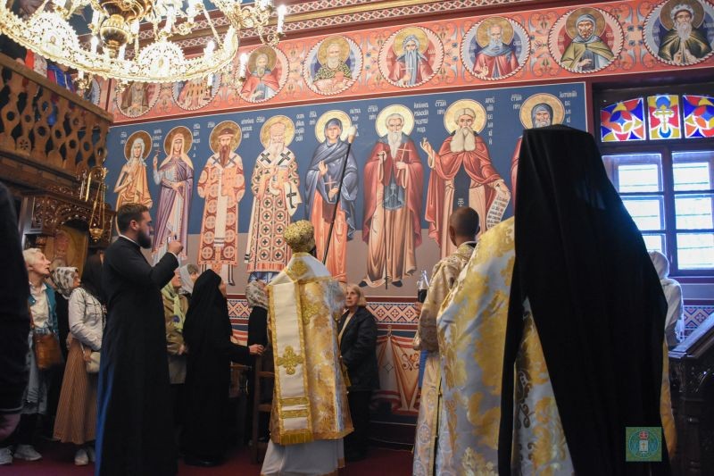 Преди началото на светата Литургия, Митрополит Арсений освети новите стенописи на манастирския храм.