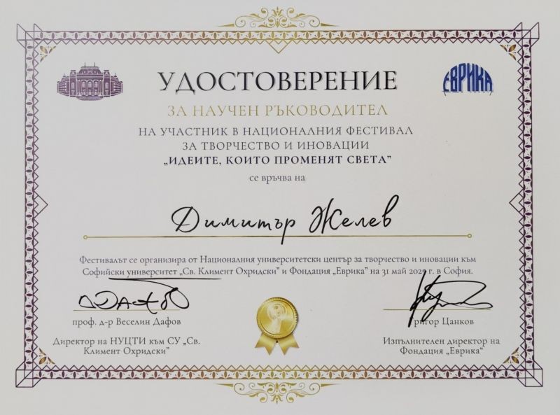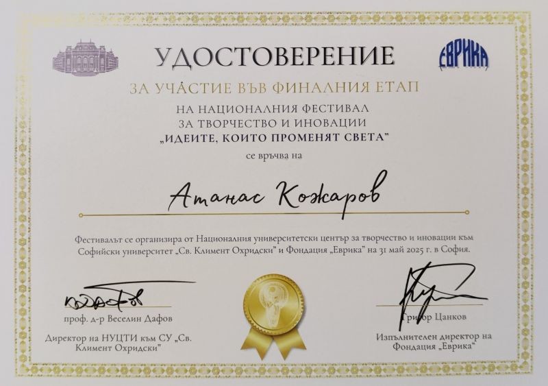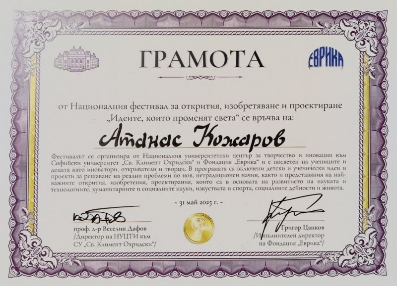 За постижението си Атанас получи грамота и удостоверение от организаторите – Националния университетски център за творчество и иновации към Софийския университет и фондация „Еврика“.