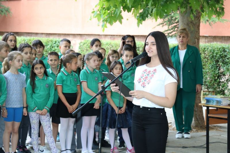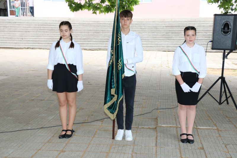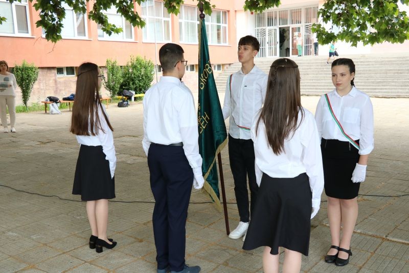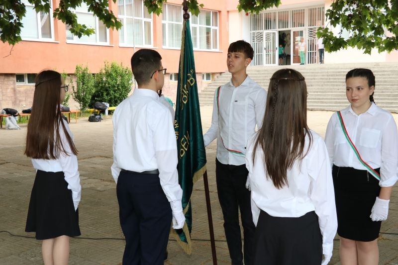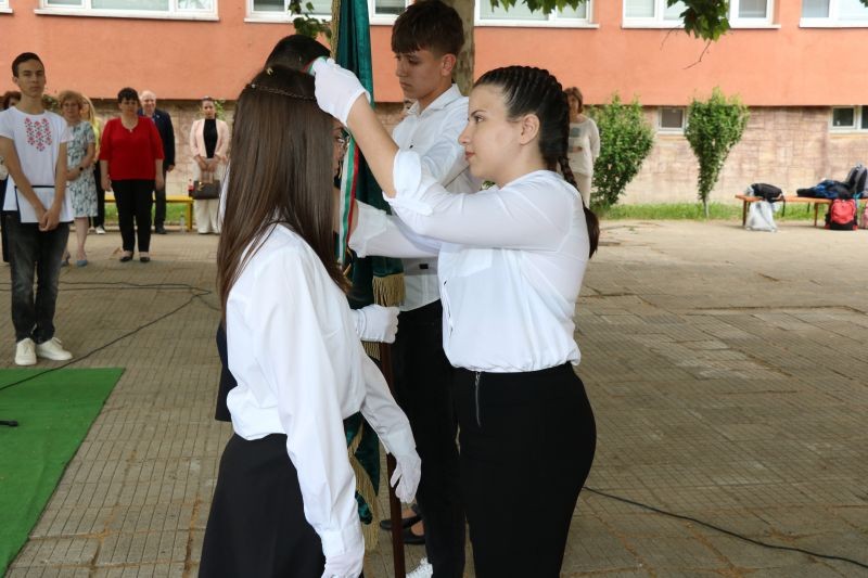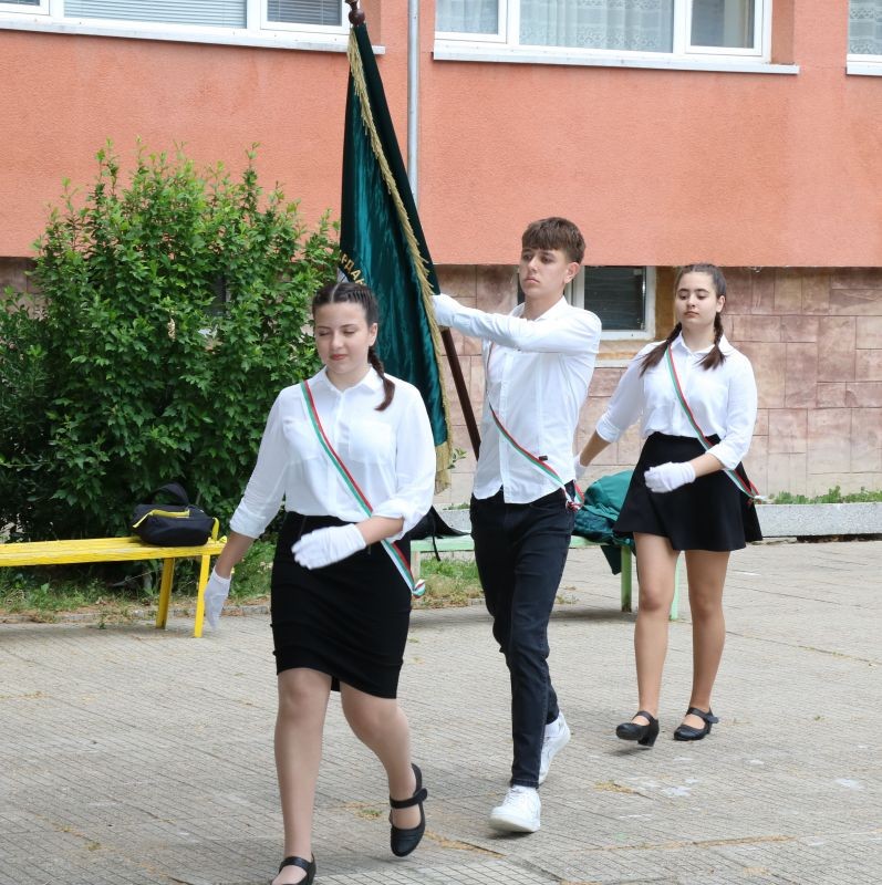 В края на учебната година нашето училище отбеляза един от най-тържествените и вълнуващи моменти – церемонията по предаване на училищното знаме. След години на достойно представяне, Габриела Жечева, Рая Чотова и Николай Анастасов с гордост го предадоха на новата знаменна група – Айшенур Хасанова, Десислава Христова и Станимир Пенков.