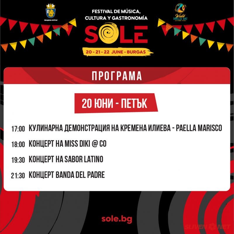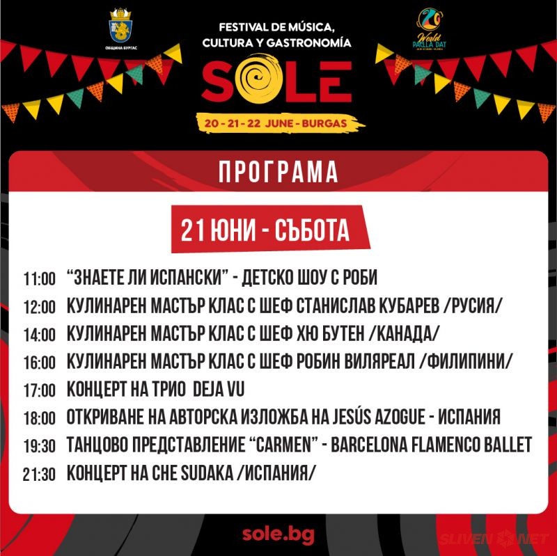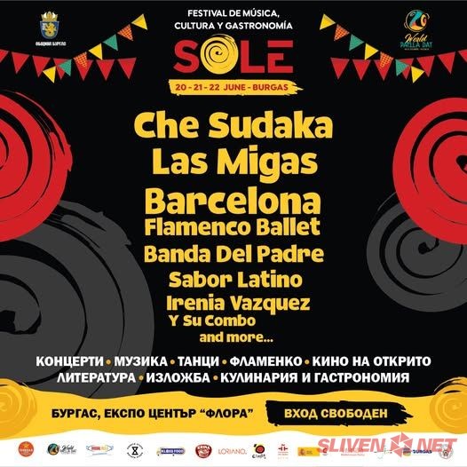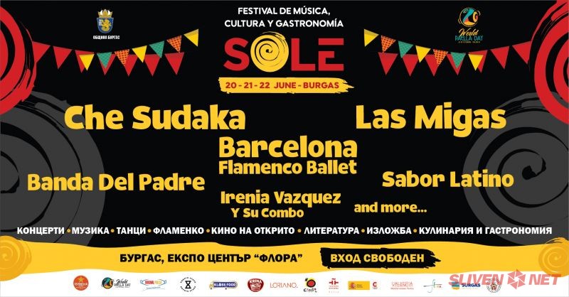 От 21 до 23 юни 2025 г. Бургас ще бъде слънце, испанска музика, аромат на паеля и вкусове от Средиземноморието! SOLE – фестивал на испанската култура и кулинария, се настанява в Бургас с много музика, изкуство и незабравими гастрономически преживявания.