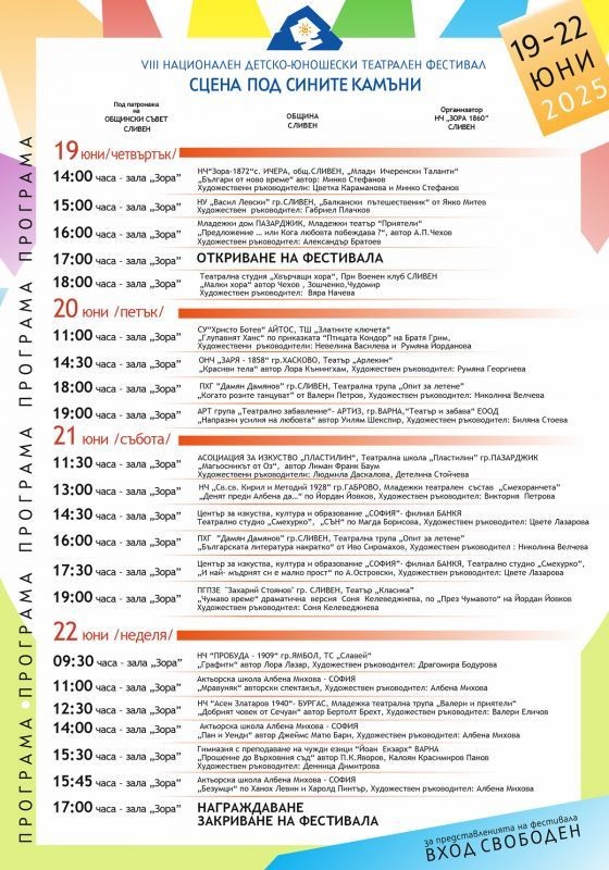Във фестивала тази година, освен домакините от Сливен, ще се включат театрални формации от Пазарджик, Айтос, Хасково, Варна, Габрово, София, Ямбол, Бургас и домакините от Сливен.