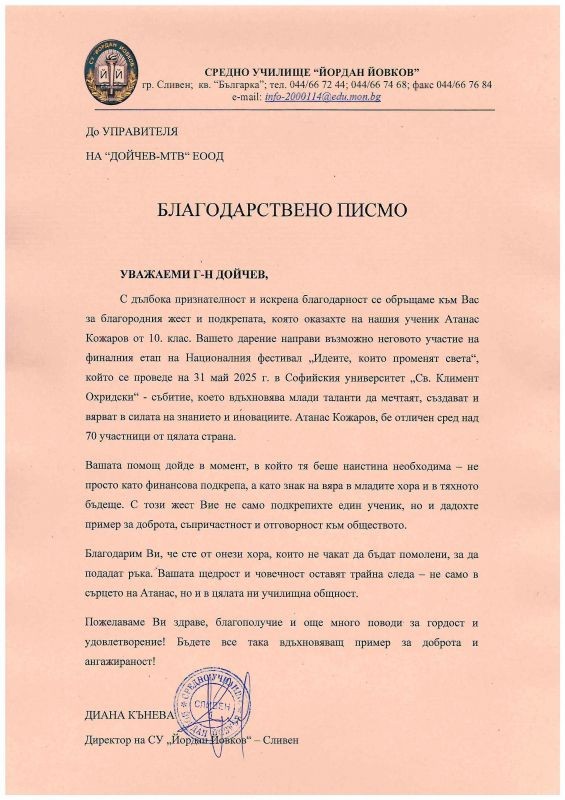 СУ „Йордан Йовков“ изказва своята искрена благодарност за дарителския жест, който даде възможност на един млад талант да представи своята идея пред национална аудитория.