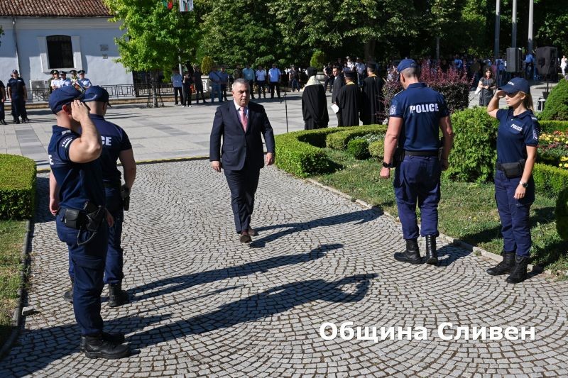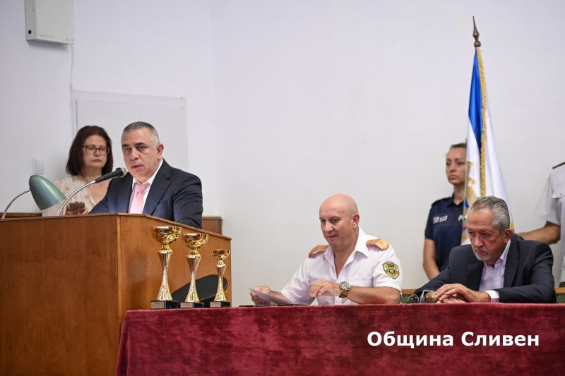 След това, в залата на Областната дирекция на МВР в Сливен, се проведе тържествено събрание, на което изявени служители бяха отличени с награди по повод годишнината. Кметът Радев използва случая и поздрави директора на ОД на МВР ст. комисар Димитър Величков и всички бивши и настоящи служители от системата. Той им благодари за всеотдайния труд и ангажимента им към опазване спокойствието и сигурността на гражданите, както за доброто сътрудничество с Община Сливен. Радев пожела на всички служители в системата и техните семейства здраве, късмет и удовлетворение.