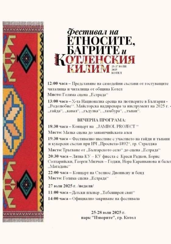 От 25 до 27 юли 2025 г. парк „Изворите“ в Котел ще се превърне в пъстра сцена на културно многообразие, традиции и изкуство по време на деветото издание на фестивала на етносите, багрите и котленския килим. Под патронажа на кмета Коста Каранашев, събитието отново ще обедини представители на българския, турския, каракачанския и ромския етнос в уникалния формат „Села на етносите“, където ще бъдат представени обичаи, носии и кулинарни традиции.