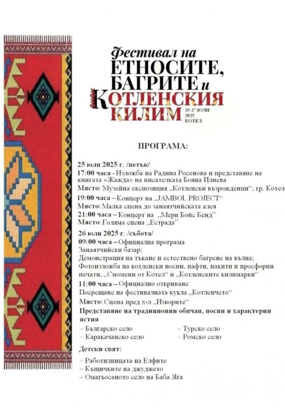 От 25 до 27 юли 2025 г. парк „Изворите“ в Котел ще се превърне в пъстра сцена на културно многообразие, традиции и изкуство по време на деветото издание на фестивала на етносите, багрите и котленския килим. Под патронажа на кмета Коста Каранашев, събитието отново ще обедини представители на българския, турския, каракачанския и ромския етнос в уникалния формат „Села на етносите“, където ще бъдат представени обичаи, носии и кулинарни традиции.