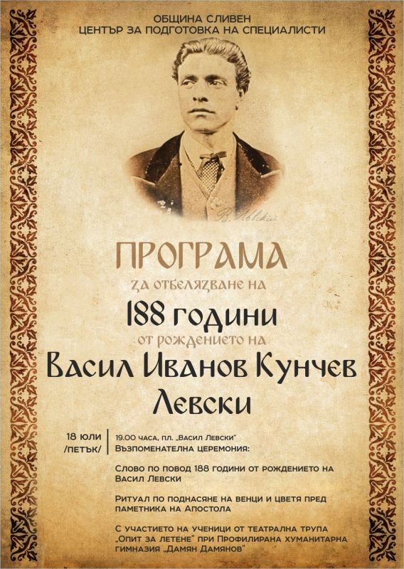На 18 юли Сливен ще отбележи 188 години от рождението на Васил Левски. От 19 часа ще се състои ритуал по поднасяне на венци и цветя пред паметника на Апостола на площад „Васил Левски“.