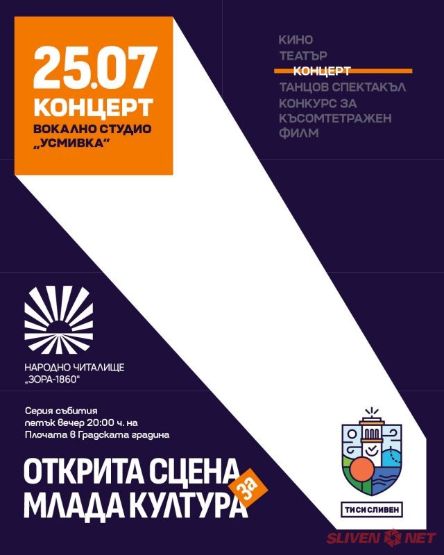 На 25 юли 2025 г. от 20:00 ч. градската градина ще се изпълни с музика, енергия и вдъхновение! Началото на инициативата „Открита сцена за млада култура“ ще бъде поставено с концерт на талантливите изпълнители от Вокално студио „Усмивка“.