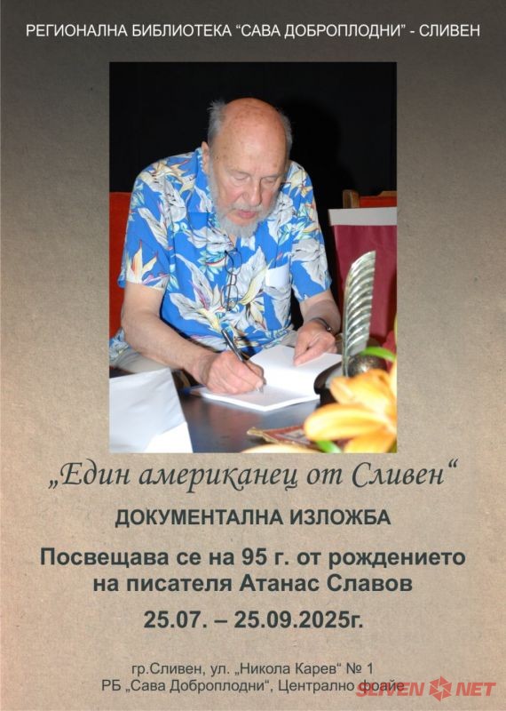 На 25 юли 2025г., в Регионална библиотека „Сава Доброплодни” - Сливен се открива документална изложба под надслов „Един американец от Сливен”, посветена на 95-годишнината от рождението на Атанас Славов - един от последните представители на интелектуалците енциклопедисти на 20 век – непримирим радетел за свобода на мисълта и словото, невероятен творец, учен, мислител, космополит, талантлив публицист, преводач, общественик. Изложбата е уредена в централното фоайе на библиотеката с продължение в литературния кабинет, в който писателят твореше в последните години от живота си и в който се съхраняват негови ръкописи, снимки, документи, пълна колекция от неговите книги и др.материали дарени на културната институция. В архива му има и солидна сбирка от материали върху живота на Учителя, теорията и практиката на дъновизма.
