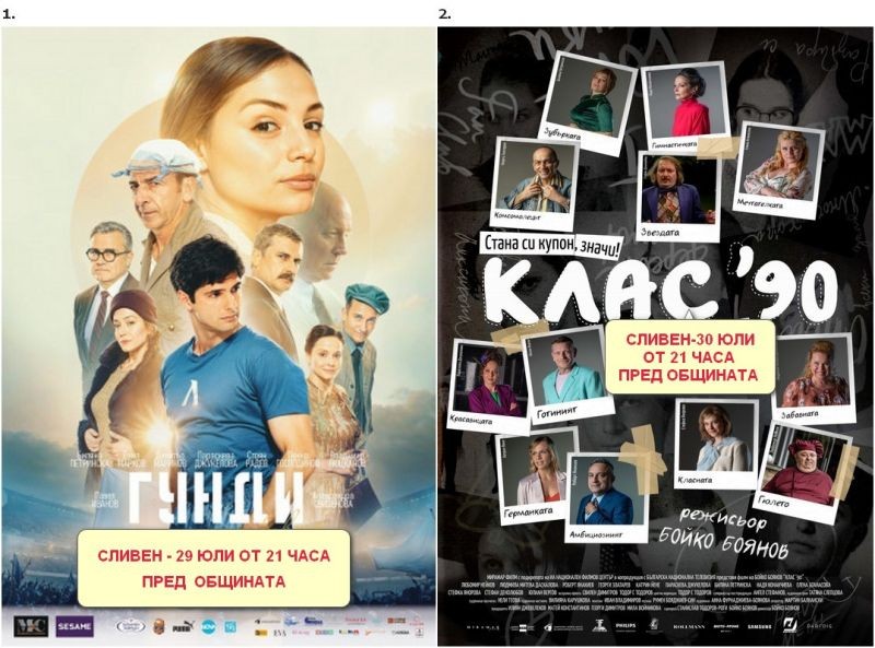 Безплатни прожекции на филмите „Гунди - легенда за любовта“ и "Клас 90" организира Община Сливен на 29 и 30 юли от 21 часа на площад „Цар Освободител“. Филмът за Гунди можете да гледате на 29 юли - вторник, а „Клас 90“ - в сряда.