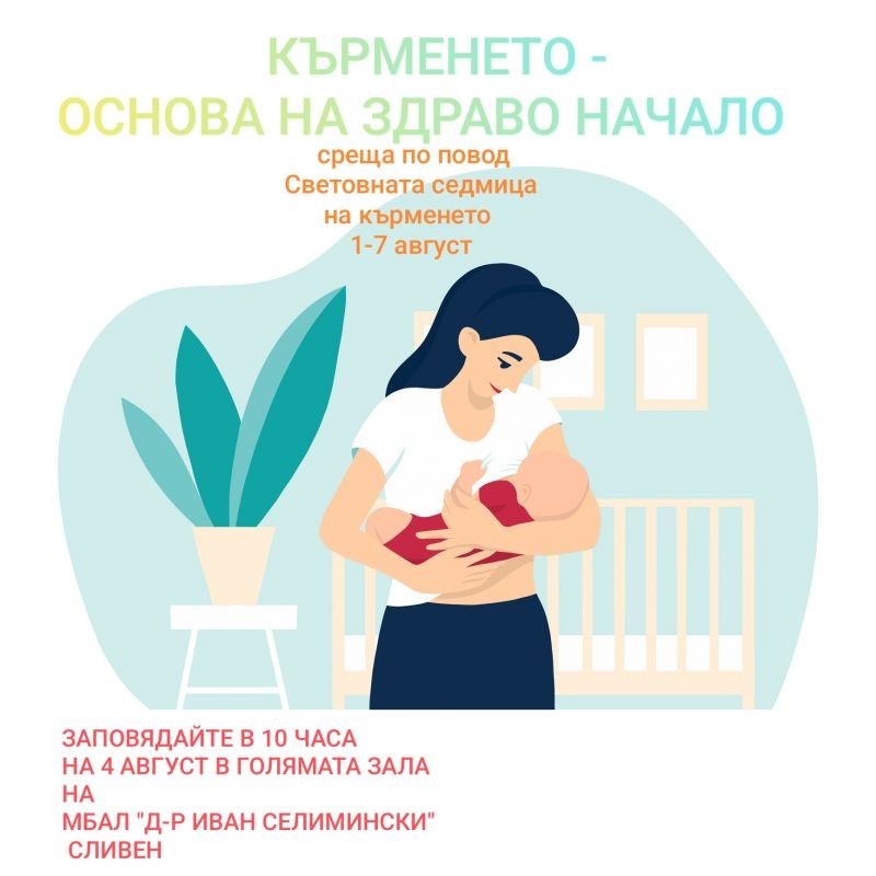 Здравно-консултативният център за майчино и детско здраве към МБАЛ "Д-р Иван Селимински", в партньорство с РЗИ - Сливен и Център за майчино и детско здраве, отправя покана за участие в информационна среща, посветена на темата: "Кърменето - основа на здраво начало". Ще бъде излъчена прожекция на филма "Гърдата е най-доброто". Поводът е Световната седмица на кърменето - 1-7 август 2025 г.