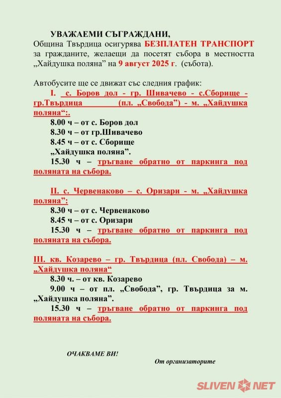 Община Твърдица организира безплатен транспорт за всички граждани, които желаят да посетят традиционния събор в местността „Хайдушка поляна“ на 9 август 2025 г. (събота).