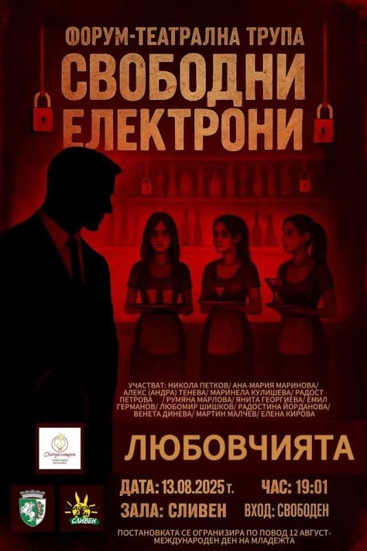 На 13 август от 19.01 часа в зала „Сливен“ младежите от театрална трупа „Свободни електрони“ ще представят премиерата на постановката „Любовчията“. Входът е свободен.