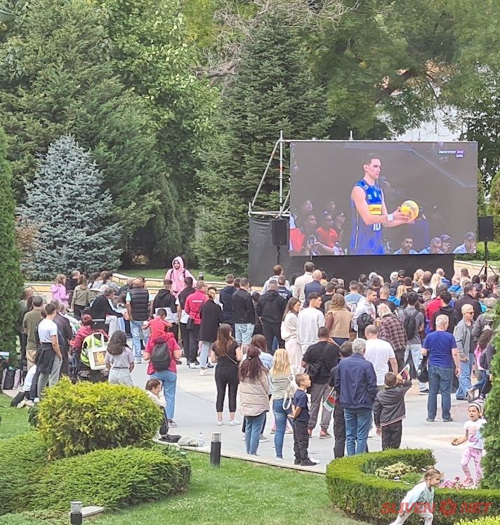 Десетки жители и гости на Сливен се събраха за пореден ден на площада пред Общината, за да подкрепят българския национален отбор по волейбол на световното първенство.