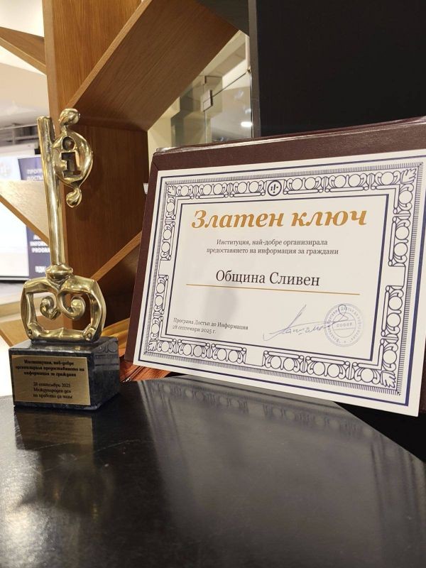 Община Сливен за пореден път бе удостоена с най-голямата годишна награда - статуетката „Златен ключ“ в категорията "Институция, най-добре организирала предоставянето на информация за граждани". Наградата бе връчена в НДК на 23-та церемония, организирана от Фондация „Програма Достъп до Информация“ /ПДИ/ на международния Ден на правото да знам. Общината е на първо място сред всички административни структури и институции на централно и местно ниво. Това е обективна оценка и изключително признание за постигнатото по прилагане на Закона за достъп до обществена информация не само през изтеклата година.
