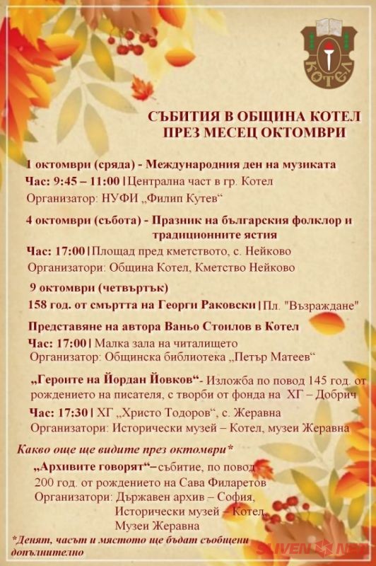 Месец октомври в Община Котел идва с дух на традиция, почит и вдъхновение. Градът и селата в общината ще бъдат сцена на музикални прояви, литературни събития, фолклорни празници и отбелязване на значими исторически личности, оставили трайна следа в местната и националната история.